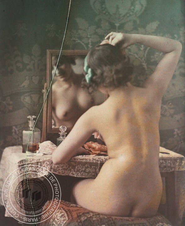 Paris, coquetterie, étude à la lumière artificielle,Léon Gimpel,11 mars 1910.Photographie positive : verre autochrome, couleur.
