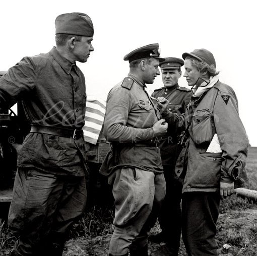 The Link-Up, Lee Miller examines a Russian officer’s medal. David E Scherman, 1945, Torgau, Germany.